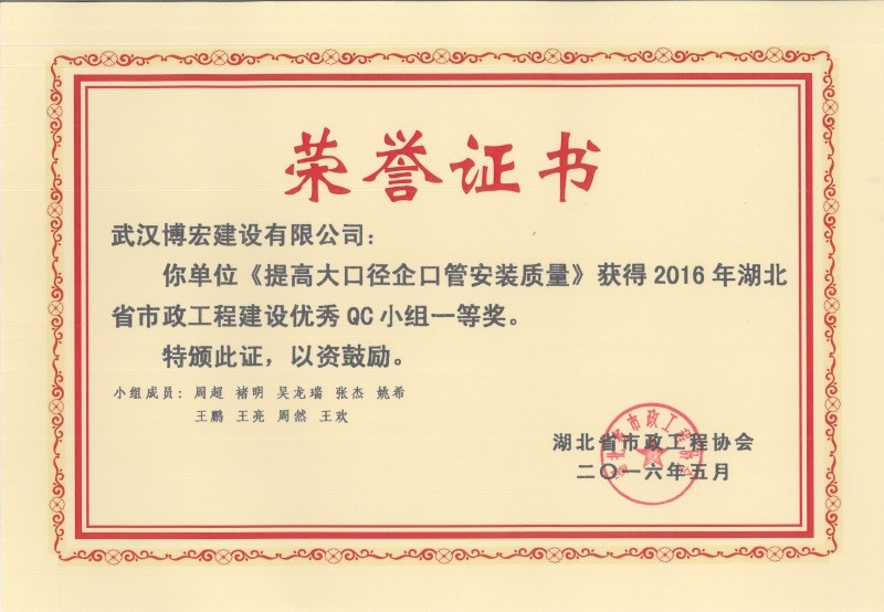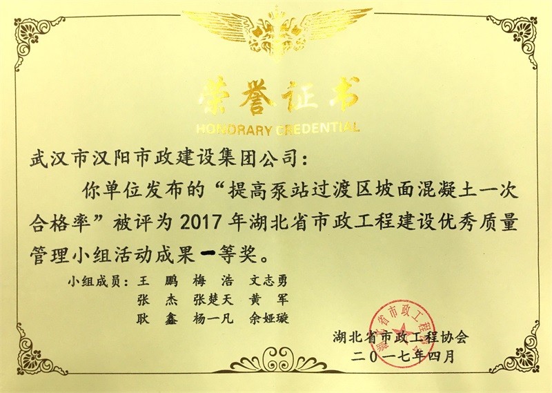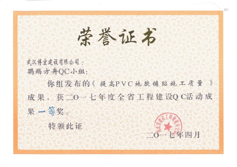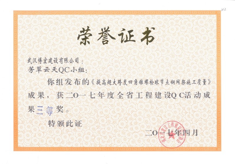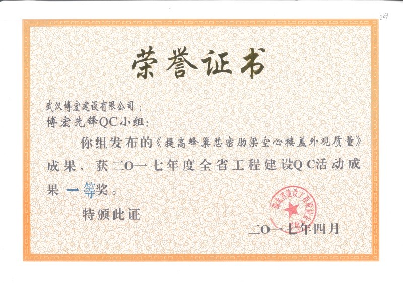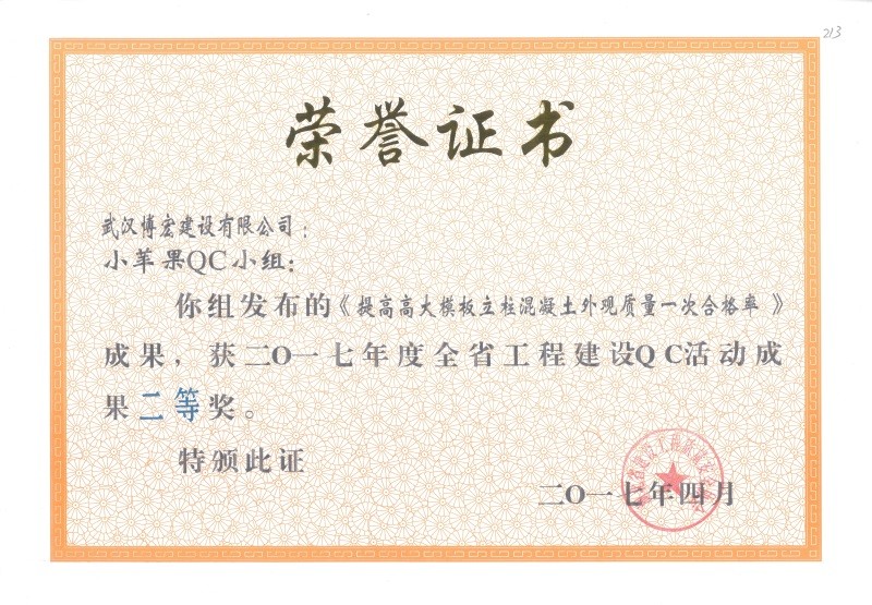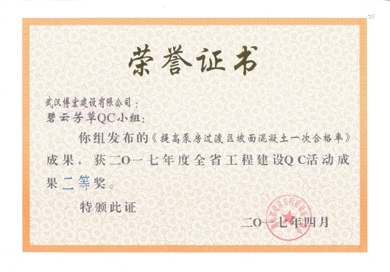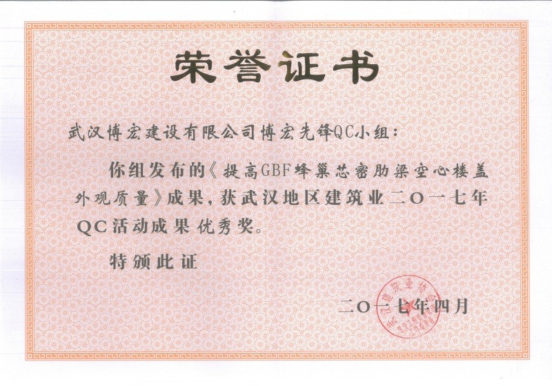 2017年武漢市地區(qū)建筑QC活動成果優(yōu)秀獎(博宏先鋒小組)