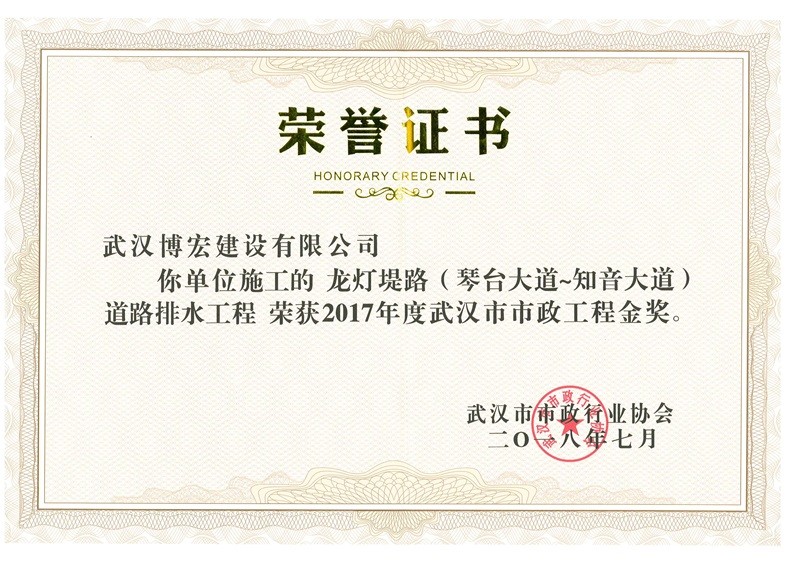 2017年度武漢市市政工程金獎(龍燈堤路(琴臺大道~知音大道)道排工程)