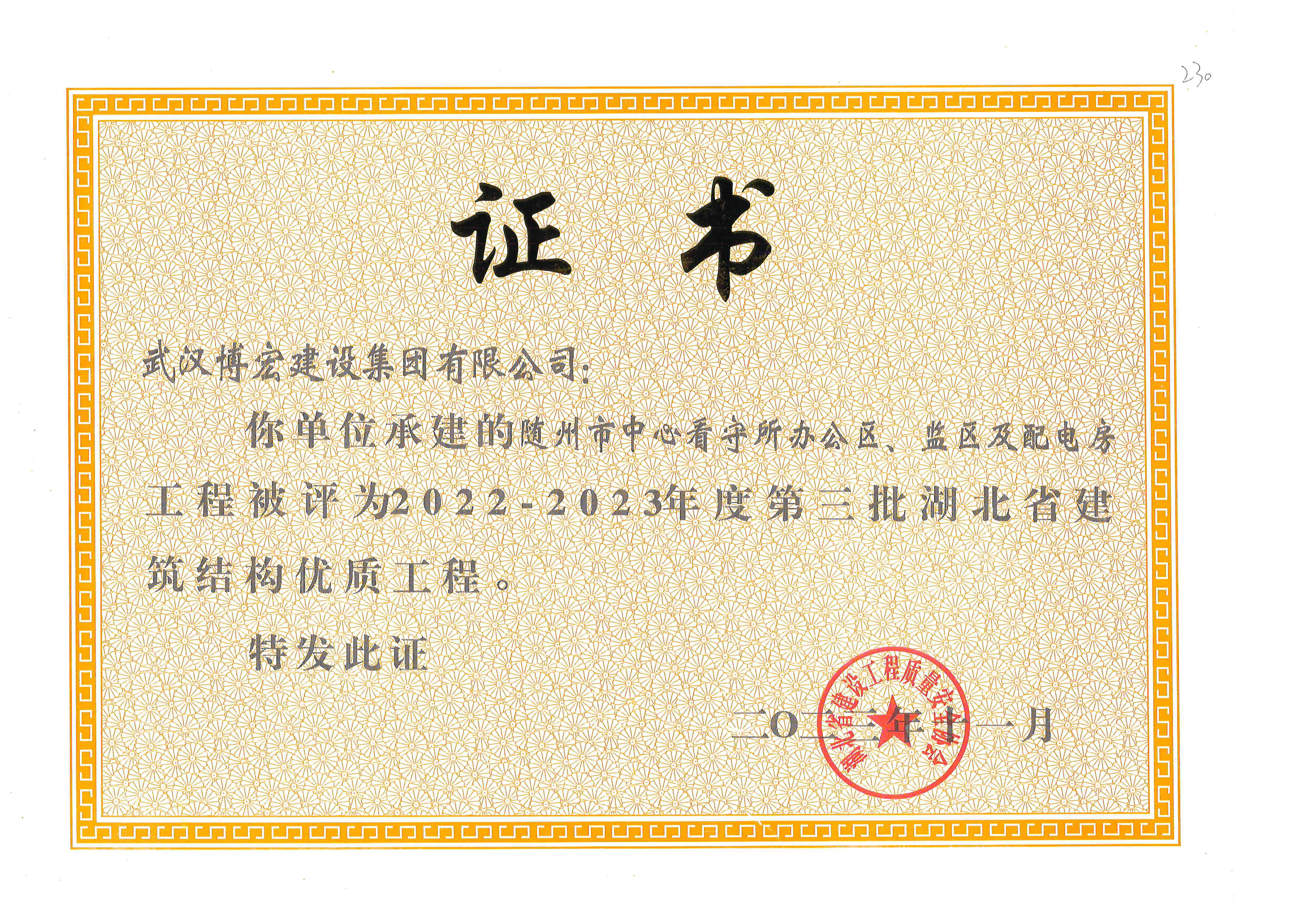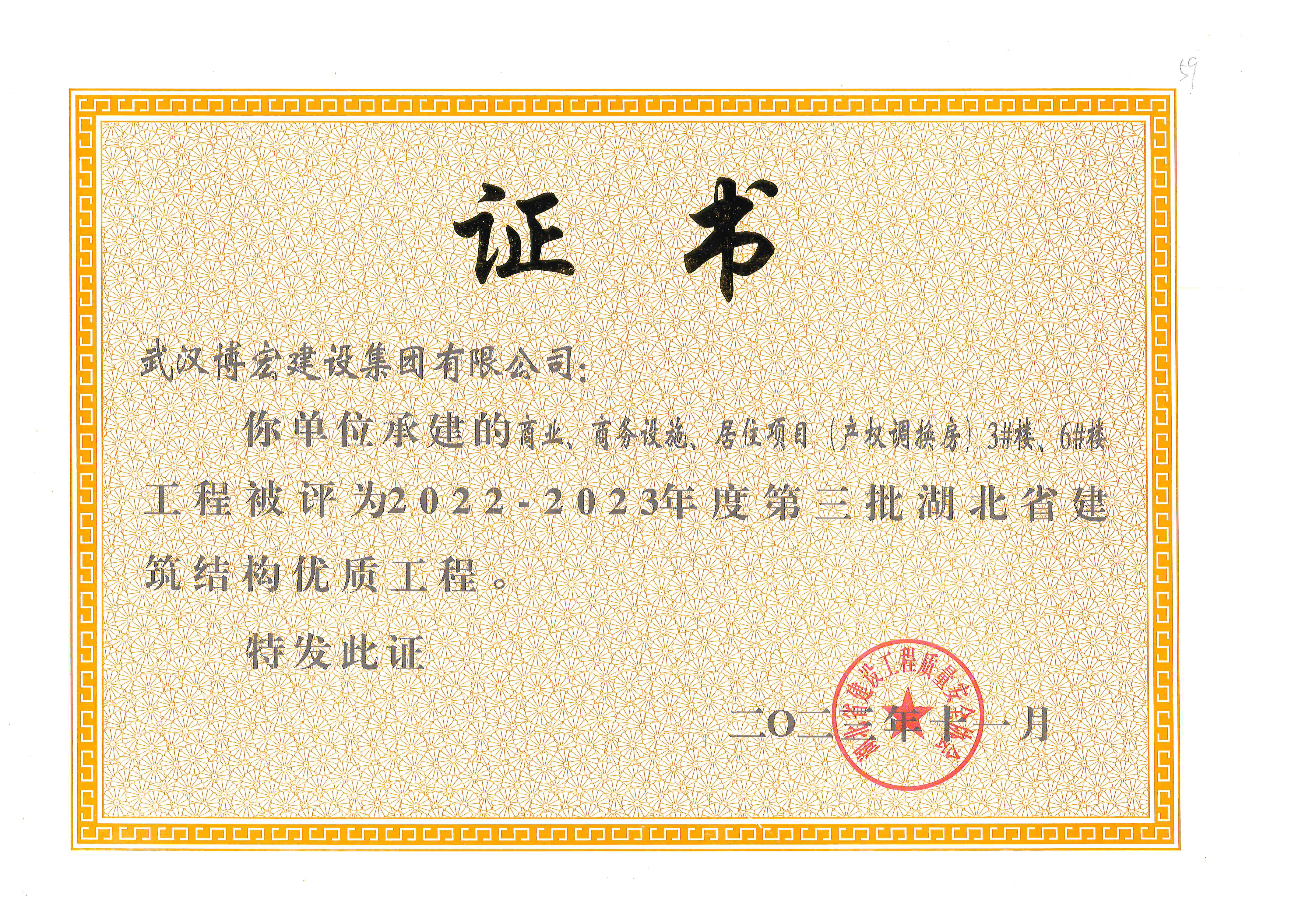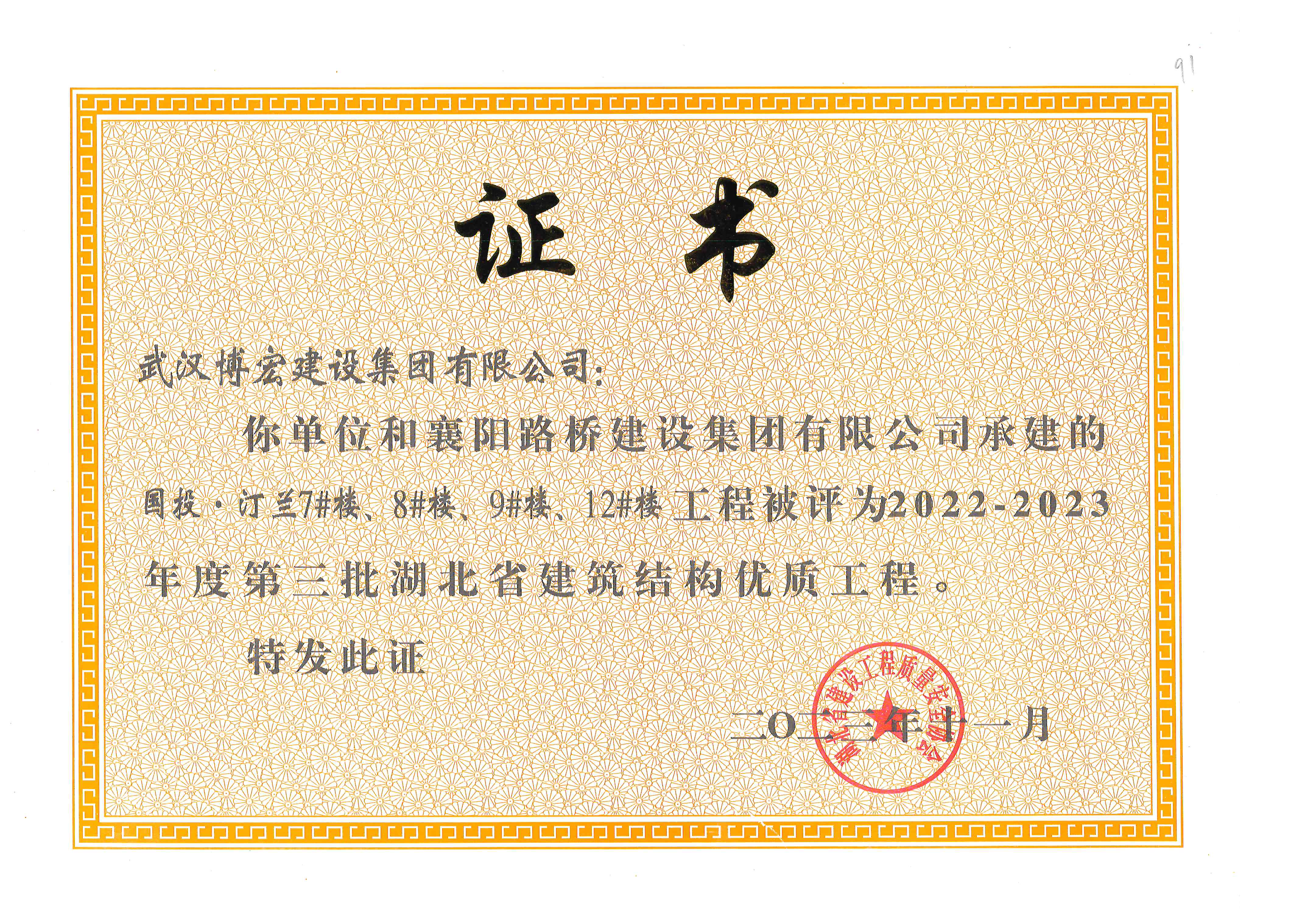 近日,湖北省建設(shè)工程質(zhì)量安全協(xié)會公布2022-2023年度第三批湖北省建筑結(jié)構(gòu)優(yōu)質(zhì)工程項目名單,由博宏建設(shè)集團承建的居住項目(黃金口村還建房B地塊)17#樓,居住項目(四臺村還建房B地塊)1#樓,新建商業(yè)服務(wù)業(yè)設(shè)施項目(中南科研設(shè)計中心)副樓,商業(yè)、商務(wù)設(shè)施、居住項目(產(chǎn)權(quán)調(diào)換房)3#樓、6#樓,國投·汀蘭7#樓、8#樓、9#樓、12#樓,隨州市中心看守所辦公區(qū)、監(jiān)區(qū)及配電房榮獲湖北省建筑結(jié)構(gòu)優(yōu)質(zhì)工程獎。