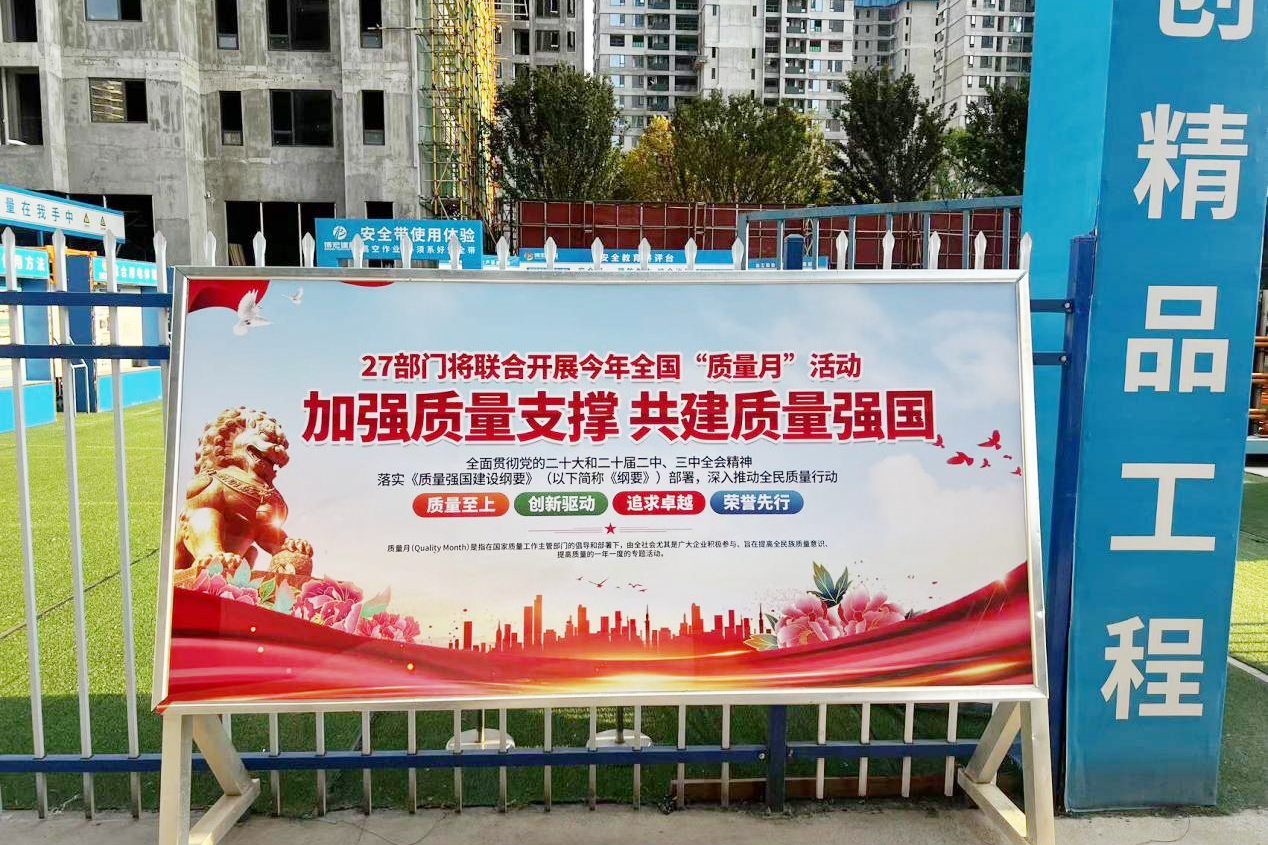 “質(zhì)量月”活動(dòng)期間,公司各在建項(xiàng)目利用橫幅、展板、宣傳畫在辦公區(qū)、生活區(qū)、施工現(xiàn)場(chǎng)等主要活動(dòng)區(qū)域?qū)|(zhì)量月進(jìn)行全方位的宣傳,努力營(yíng)造人人關(guān)心質(zhì)量、重視質(zhì)量、參與質(zhì)量、享受質(zhì)量的濃厚氛圍。